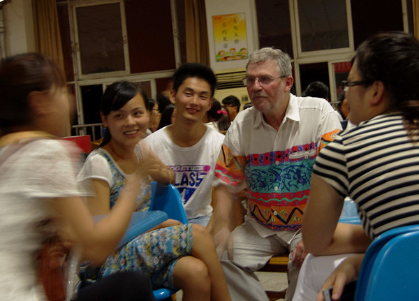 搬桌椅、发话题纸条……每周五晚在安庆师范学院安苑食堂都有“英语角”活动,但6月26日晚的这一次和以往不同,前来的数百名学生都有些伤感。在安师院执教8年的外教斯蒂芬即将离开学校,他努力保持着微笑,因为这可能是他在校参加的最后一次活动,他希望尽量给同学们留下欢乐。
