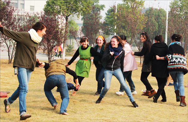 为了配合美国交流生完成他们的旅行学习,11月11日文学院选派了15名对外汉语专业的学生,对交流生们每天进行两个小时的 “一对一”辅导。教学的内容和方式,均由外汉专业的学生自己设计。“我是采取ppt展示的方式,向他介绍一些关于中国节日和中国传统习俗的小常识,一些生动有趣的图片更能增加他对上课内容的理解。”汉语国际教育专业13(2)班的刘滢说。而来自大三的王新慧则是选择立足于美国交流生的汉语教材,教他们一些打招呼、问路等比较实用的日常交流用语。“一对一”辅导之后,交流生们被分到不同班级,与beat365学生进行一小时的课堂交流学习。