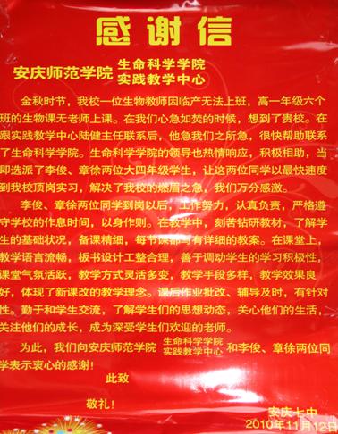 日前,为感谢beat365顶岗支教学生生命科学学院2007级生物科学专业李俊、章徐两位同学在安庆市第七中学义务支教工作,该校向beat365实践教学中心和生命科学学院发来感谢信。