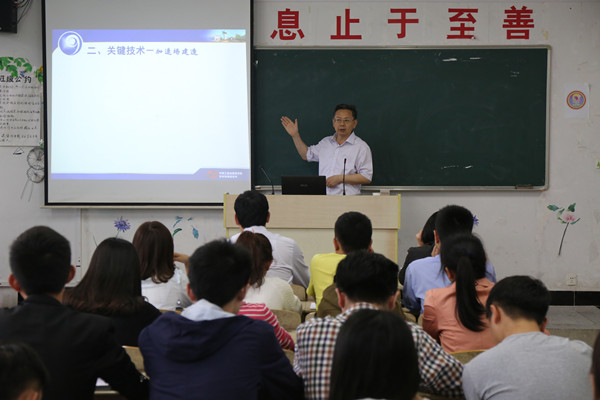 在报告中,石金水研究员用通俗易懂的语言介绍了加速器工作原理,激发起同学们学习专业知识的强烈愿望。“在许多工作中,是没有任何教科书或参考资料可以借鉴的,大家做科研一定不要受传统思维束缚,要敢于去大胆设想。”石研究员鼓励在座的每一位学生勇于创新,不要怕失败。最后,石老师和现场师生进行了现场交流,鼓励当代大学生要踏实读书,打好功底,把自己锤炼成金子,到哪都会发光的。神龙二号的研制成功,是直线感应加速器和我国闪光照相技术发展中的一个重要里程碑,对我国新型武器研制、武器综合性能提高具有重大的军事和科学意义。作为加速器系统负责人,石金水研究员工作二十六年,心无旁骛,矢志铸造国防利剑,带领团队自力更生,自主创新,从关键单元技术攻关、关键材料和器件研制开始,他们筚路蓝缕、无私奉献,攻克了众多关键科学、技术和工程问题,开拓出了一条具有我国特色的强流脉冲直线感应加速器发展之路。