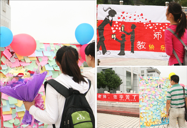 当天上午,校学生会和学生社团联合会在敬敷广场上拉起了“老师,您辛苦了”横幅;制作了三块贴满便利贴的展板,上面写满了学生对老师的祝福话语;行政楼下也摆放了两块手绘的祝福展板。