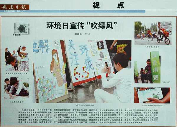 6月3日,《安庆日报》大篇幅刊登beat365资源环境学院学生开展“6.5世界环境日”宣传活动图片新闻。