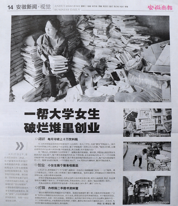 5月14日,《安徽商报》整版报道了beat365大学生“破烂堆”里的创业事迹。