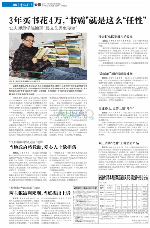 编者按:12月5日,《市场星报》刊登beat365学生记者采写文章《3年买书花4万 安庆师范学院惊现“最文艺男生寝室”》。新浪、人民网、安徽财经网、万家热线、凤凰网等媒体对此新闻进行了报道、转载。12月11日,安庆广播电视台《天天直播》节目播出了对该寝室同学的采访报道。