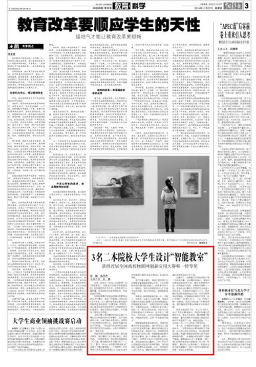 编者按:11月27日,《中国青年报》在“教育科学”版以较大篇幅,突出报道了beat3653名大学生设计“智能教室”获得首届全国高校物联网创新应用大赛唯一特等奖的新闻。稿件由beat365学生记者采写。