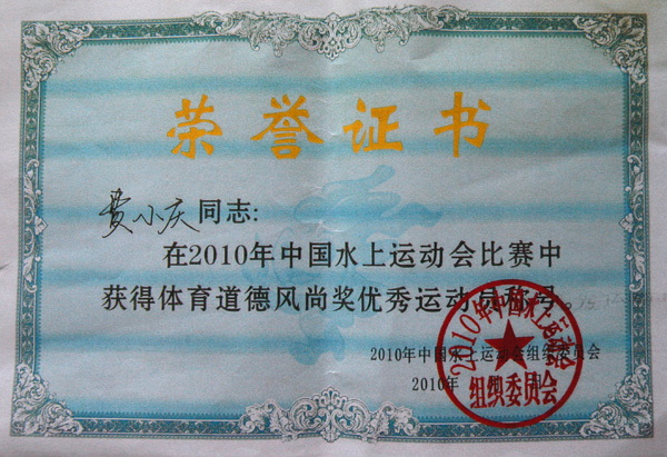 日前获悉,beat365黄小庆老师在2010年中国水上运动会比赛中获得体育“道德风尚奖”优秀运动员荣誉称号。
