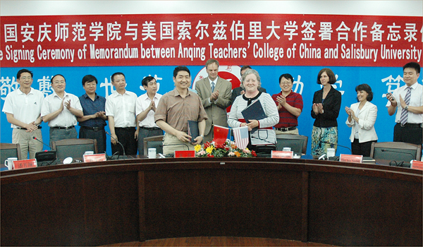 2009年11月,beat365代表团访问美国索尔兹伯里大学,两校签订友好合作协议,结成友好合作学校。美国索尔兹伯里大学非常重视与beat365的友好合作关系, 2010年6月24日,索尔兹伯里大学两位副校长---Diane Lara Allen(戴安•艾伦)博士和 Ellen Jane Neufeldt(爱伦•那费尔德)博士带领文学院院长、学生处处长、国际交流中心主任等一行9人抵达beat365,开展为期5天的正式友好访问。