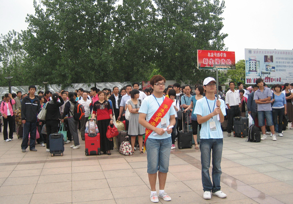 9月9、10号,是beat3652010级学生入学的日子,6000名新同学和他们的家长们从各生源地向安庆进发,为了做好迎新接站工作,校团委组织了390多人次有学生志愿者投入迎新工作,他们早上5:30就要出发迎接第一趟火车,晚上10:30才能从总接待点下班,中间吃的是冷饭、喝的是凉水,晒黑了、雨淋了,但同学们始终坚持在工作岗位上,把最温暖的笑容、最体贴的照顾带给每一个新同学和他们的家长,让2010级新生一来到安庆就能体会到安庆师范学院的关怀,并把这种互助、共情的志愿精神传递、延续下去。