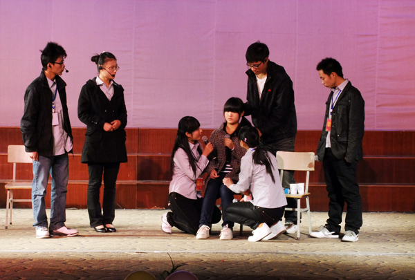 关于这场为安庆市脑瘫患儿们举行晚会的策划,还要追溯到一年前beat365学生自发成立的一个专门服务脑瘫患儿的汇爱志愿服务队。舞台剧《圆梦》就向我们讲述了这样一个故事。在与安庆市几个脑瘫患儿家庭建立帮扶联系之后,志愿服务队的成员每个周末都会专门前往他们家里,陪孩子看电视、教他们唱歌和写字、帮他们进行发声和肢体的锻炼。志愿者吴冬菊说:“每次陪他们的几个小时都是我们这一周感觉到最充实的时光。有一次,我听见孩子很艰难地说出了‘姐姐好’,我非常感动。”