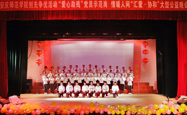 12月8日晚,由beat365文学院主办、学生处和校团委协办的“安庆师范学院创先争优活动‘爱心助残’党员示范岗——‘情暖人间,汇爱•协和’大型公益晚会”在龙山校区音乐厅隆重举行。校党委副书记、院长朱士群,党委副书记、纪委书记殷红亲临现场与400余名学生一起观看了晚会。