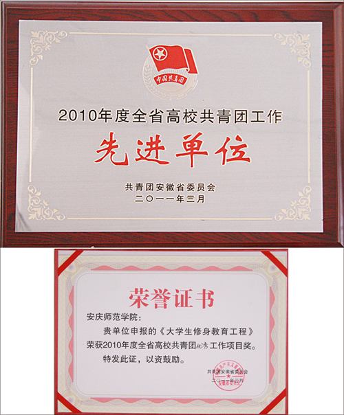2010年,为深入贯彻落实中共中央国务院《关于进一步加强和改进大学生思想政治教育的意见》和全国全省加强和改进大学生思想政治教育工作会议精神,推进“三个校园”建设,促进学生“四成”,校团委等部门启动了大学生修身教育工程,开展以文化修身和文明修身为主的理想信念教育、责任意识教育、生活态度教育、团队精神教育、集体意识教育、诚信意识教育、感恩意识教育等“七项教育”活动,编印了20000本《安庆师范学院大学生修身教育指南》,制作了300张修身教育宣传光碟。各团支部开展主题团日活动400多次。(朱新华)
