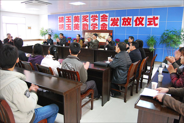 胡玉美公司总经理蒋立胜向同学们介绍了胡玉美公司的发展历程,他希望同学们自强不息、学有所成。“真诚希望学校能够充分利用学科专业优势,继续加强与公司在员工培训、订单式培养、课题申报等方面的交流与合作,努力打造优质的校企合作品牌”。在接受记者采访中,谈到设立奖助学金的目的时,他认为,“企业发展离不开社会各方面的帮助和支持,对此,企业应该做出回报,百年大计,教育为本,通过捐资助学的方式帮助品学兼优的学生成才,希望他们能够好好学习,不要辜负社会、公司的一片爱心,早日成为国家的栋梁。”