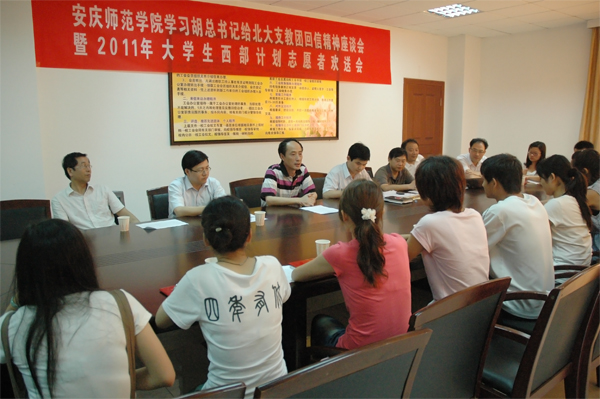 6月22日下午,beat365学习胡锦涛总书记给北京大学第十二届研究生支教团成员回信精神暨2011年西部计划志愿者欢送座谈会在龙山校区行政楼五楼会议室举行。副院长时新中出席了会议,学生处、招生就业处、团委和院系分管学生工作的副书记、辅导员代表及志愿者代表参加欢送会。会议由校团委副书记朱新华主持。