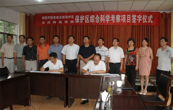 签字仪式上,鹞落坪国家级自然保护区党委书记储卫星与生命科学学院吴甘霖院长分别代表鹞落坪国家级自然保护区和安庆师范学院正式签订《鹞落坪国家级自然保护区综合科学考察》项目合同书。
