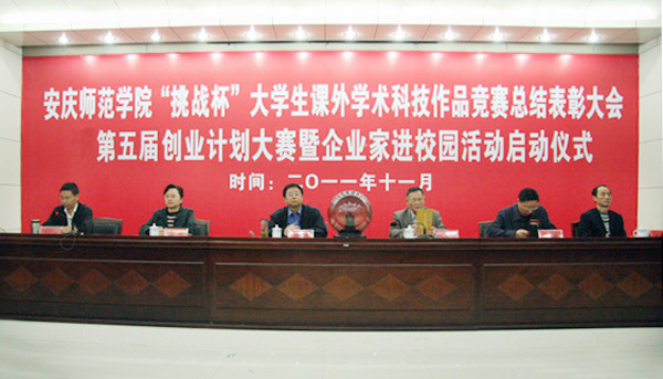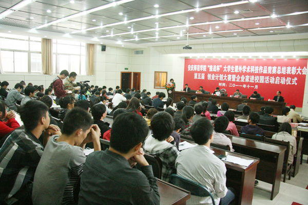 在热烈的掌声中,校领导向获奖教师、学生代表,获奖单位和部门颁发了“挑战杯”校级、省级和国家级奖项。获奖教师和学生代表分别作了热情洋溢发言。安庆市高新创业服务中心主任何渊为大学生做了一场题为《科技企业孵化器与大学生创业》的专题创业培训讲座。