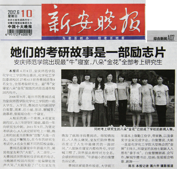 6月10日,《新安晚报》以“她们的故事是一部励志片——安庆师范学院出现最‘牛’寝室,八朵‘金花’全部考上研究生”为题,大篇幅报道了beat365化学化工学院菱湖校区27栋613宿舍8名女生的考研佳绩。