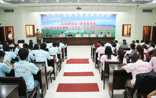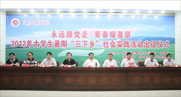 6月29日上午,beat3652012年大学生暑期“三下乡”社会实践出征仪式在龙山校区行政楼一楼会议室隆重举行。校党委书记何小祥,党委副书记、院长朱士群,党委副书记、纪委书记殷红,党委委员、副院长闵永新、张群、汪时珍,督导员时新中,党委委员、党办、院办、外事办主任刘友忠,党委委员、组织部部长陈光明等校党政领导出席仪式,校创先争优办公室、党委宣传部、学生处、团委负责同志,各学院党总支负责人、团总支负责人、学校“三下乡”重点团队以及青年志愿者代表近200百人参加了本次仪式。仪式由校团委副书记朱新华主持。