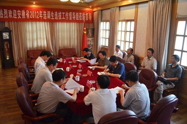 7月19日上午,由省委组织部公务员处处长张强、省公务员局考录处调研员明武、省委教育工委组干处副主任科员梅梅组成的安徽省2012年选调生选拔工作督导组莅临beat365,对beat3652012年选调生选拔工作情况进行督查指导。党委书记何小祥亲切会见了检查组一行,对检查组前来指导工作表示热烈欢迎和衷心感谢。
