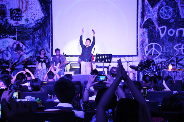演出当晚,26首歌曲几乎让欢呼声响彻了整晚。无论是摇滚还是舒缓情歌,“先进集体“都能将现场气氛调动到高潮。重金属音乐与极具节奏的频闪灯之间的配合让全场观众近乎疯狂。背景墙上醒目的“Don’t stop”似乎是告诉大家今晚的狂欢不要停下来。其实,这并不是“先进集体”的第一次演唱会,三年前的同一天晚上,在容纳近千人的篮球馆,他们举办了第一场演唱会迎接大学生活,也就是在这场演唱会后,他们约定毕业时还要办一场演唱会向大学告别,今晚,他们圆梦了。