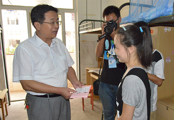 9月12日是新生报到的第一天,数学与计算科学院的小王同学一个人来到学校进行了报到。她小时候,父母就不幸离世,她和弟弟一起在亲戚家寄养长大。让她大为感动的是,当天上午她刚刚在宿舍安顿好,校党委书记何小祥就赶了过去,向她送去了慰问金。