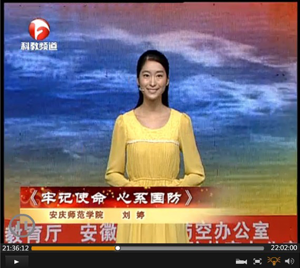 9月21日晚,安徽电视台科教频道播出beat365文学院学生刘婷参加安徽省高校“人防杯·国防在我心中”演讲比赛展演的实况。省委常委、省军区政委宋海航,省人大常委会副主任胡连松,副省长方春明等省政府、省军区、省教育厅的领导现场观看了展演。