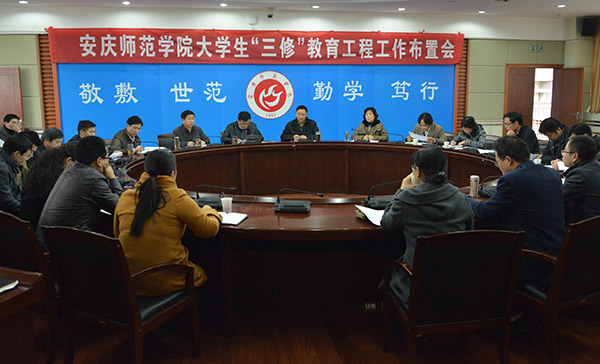 校团委书记鲍硕来详细报告了“三修”教育工程的实施背景、指导思想、工作思路和具体工作安排,宣传部、学生处、保卫处、教务处、后勤管理处、后勤服务集团等职能部门负责人分别结合文明创建、学生教育管理、校风校纪巡查、后勤管理服务等工作实际,就如何推进“三修”教育工程进行了补充说明。参会人员充分讨论了《安庆师范学院大学生“三修”教育工程实施意见》,并就如何有效开展“三修”教育工作积极献言献策。