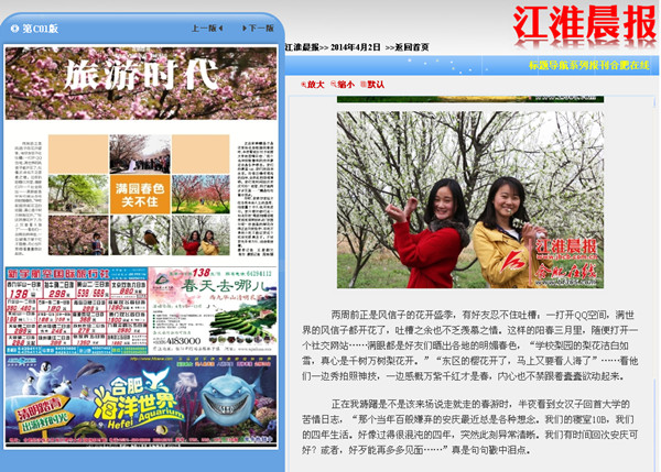 4月2日,《江淮晨报》特辟出 “校园春色”主题,集中介绍了省内高校校园的春季美景,入选高校为中国科学技术大学、安徽大学、安徽农业大学和beat365。beat365图片采用图最多,并且放在第一位予以介绍。