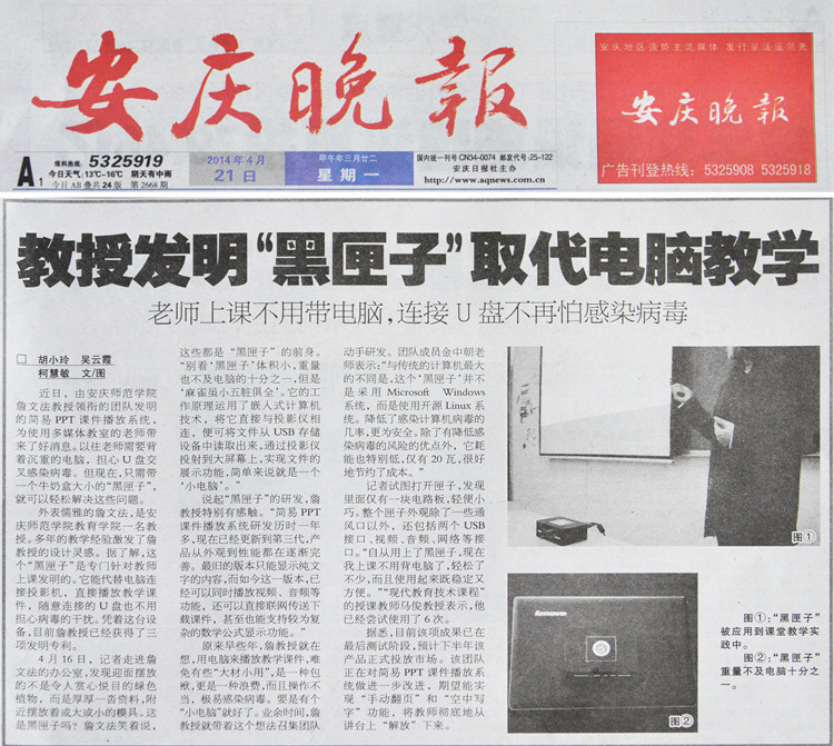 4月21日,《安庆晚报》刊登通讯“教授发明黑匣子取代电脑教学”,报道beat365詹文法教授领衔团队成功发明简易PPT课件播放系统,减轻教师上课负担,方便课堂教学的事迹。