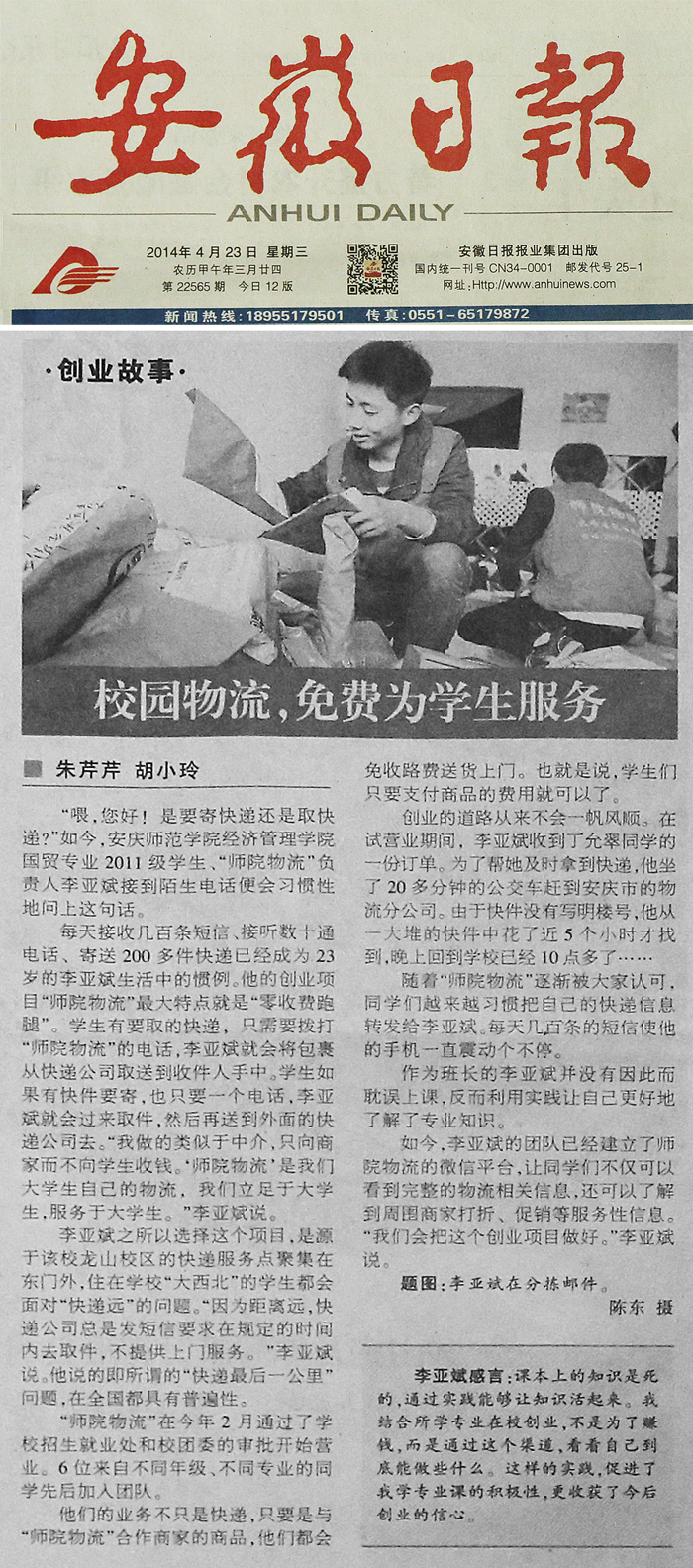 4月23日,beat365经济管理学院国贸专业2011级学生李亚斌创办的“师院物流”再获重要媒体关注,《安徽日报》在当天的“创业故事”专栏刊发文章《校园物流,免费为学生服务》,介绍了这个源自beat365的大学生创业项目。之前,李亚斌同学的创业故事和创新精神已被《安庆晚报》用整个版面加以深度报道,并在新浪网、人民网、中国日报网等重量级媒体及数十个省级物流专业网站刊出、转载。