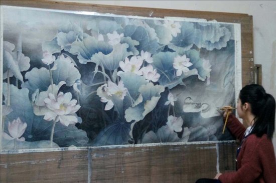 荷塘月色下,两只鸳鸯在戏水缱绻,远处一只站在荷茎上的鸟儿饱含深情地回望着这对恩爱伉俪。这幅规格六尺的工笔画,从构思、设计到绘画均是出自毕业生刘梦娜一人之手。刘梦娜说,“这是送给父母的礼物。”