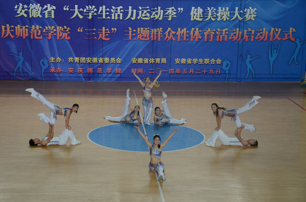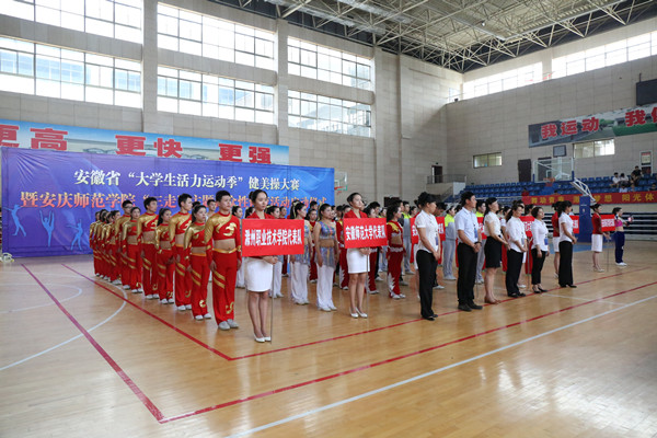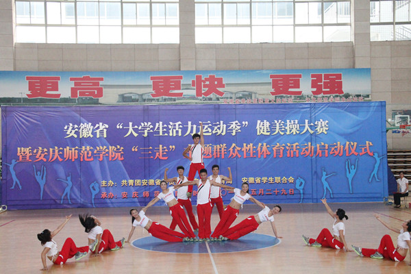 5月29日上午,安庆师范学院体育馆内歌声嘹亮,激情飞扬。安徽省“大学生活力运动季”健美操大赛暨安庆师范学院“三走”主题群众性体育活动启动仪式在这里隆重举行。校党委委员、副院长闵永新,共青团安徽省委学校部副部长刘存磊,共青团西藏自治区委员会青工部副部长秦琳、安庆职业技术学院副院长毕明生出席大赛开幕式。黄山学院等兄弟院校有关负责同志、beat365各学院党总支负责人、校团委等有关部门负责同志和数百名学生代表一起观看了比赛。来自安徽师范大学、淮北师范大学、合肥师范学院、黄山学院、滁州职业技术学院、安庆职业技术学院和安庆师范学院等高校的7支代表队参加了比赛。