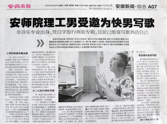 编者按:6月23日,《安徽商报》大篇幅刊登beat365学生记者采写的新闻《安师院理工男受邀为快男写歌》,报道了beat365数学与应用数学专业2012级学生、已发行两张专辑的音乐男孩朱一帆的创作历程与音乐梦想。新浪、新华网、人民网等重要媒体也在第一时间刊发了这则新闻。