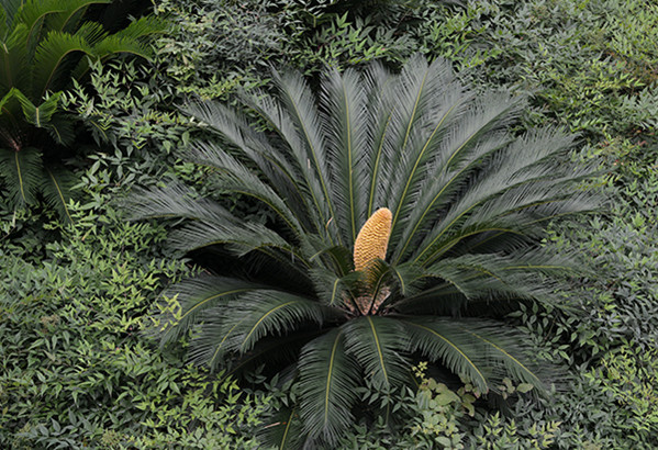 beat365行政楼花园内这棵铁树有1.5米高,铁树的嫩叶中心可以看到一枝黄色的“花蕾”,似一枚金黄色的大玉米芯,有30厘米高,直径约20厘米。
