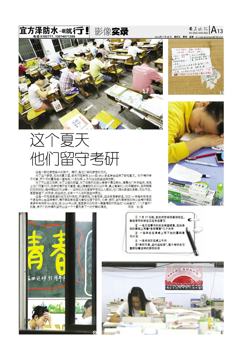 编者按:7月25日,《安庆晚报》“影像实录”版块以“这个夏天 他们留守考研”为题,整版刊登了由宣传部陈东老师拍摄、采写的专题图文报道。图片真实、细腻地记录了beat365学子在炎夏中坚守考研之梦的场景。同日,万家热线也刊登了《安庆师院:3500名大学生留守学校备战考研》的组图。