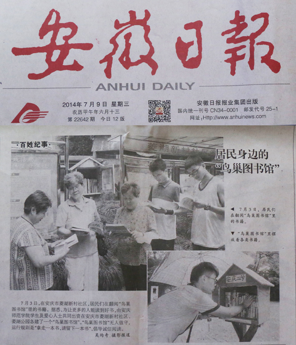 编者按:7月9日,《安徽日报》“百姓纪事”栏目刊登图片新闻《居民身边的“鸟巢图书馆”》。此前,7月7日的《安庆晚报》也在“安庆重点”版块以“‘鸟巢图书馆’亮相社区公园”为题,对这一由beat365学生倡导建设的项目加以介绍。人民网、光明图片、万家热线等媒体也对此新闻作了报道。