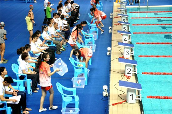 7月12日游泳预赛,42名志愿者承担看管运动员的物品、入场检录、成绩检录、比赛全程摄像的工作。本次省运会,共有675名志愿者全程参与服务。