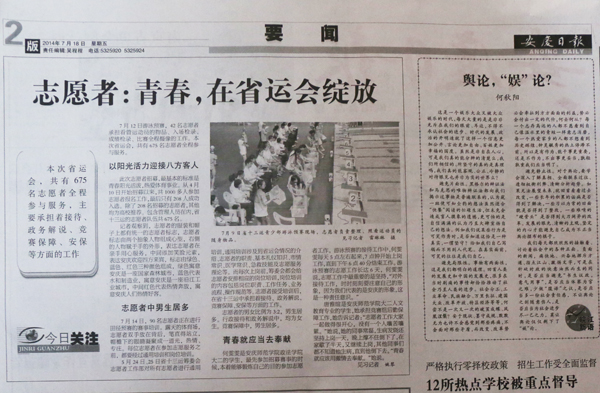 编者按:7月18日,《安庆日报》“要闻”版块刊登文章《志愿者:青春,在省运会绽放》,对以beat365为主的省运会志愿者进行了报道。