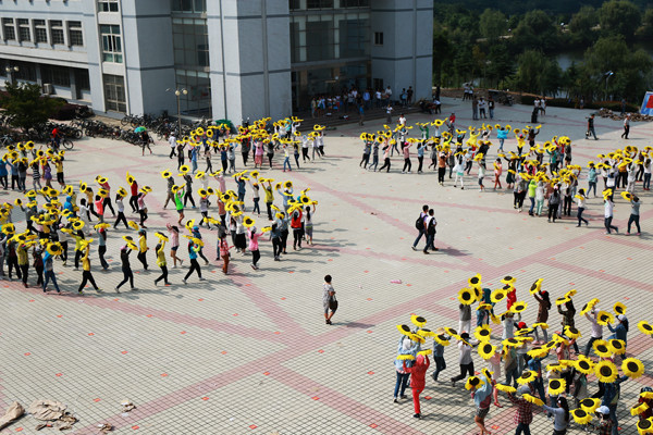 “我们在大太阳底下排练最辛苦了,那时候节奏不齐,就得一遍遍重来。手一直举着到酸了还得坚持。” 汉语言文学专业13级孟雨婷说。克服了时间、场地等困难,志愿者们一路坚持了下来。许多个中午,烈日当空,她们却包裹得严严实实,戴着墨镜口罩,手里拿着替代道具小葵花,因此被同学们昵称“小葵花”。
