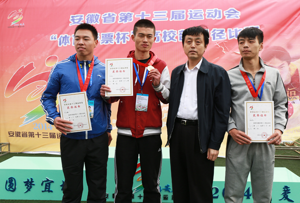 10月11日下午,在安徽省第十三届运动会高校部田径比赛中,beat365体育学院马立众同学以14.80米的成绩荣获男子三级跳远项目冠军,取得beat365在本届省运会中的首枚金牌。10月13日,马立众在男子丙组跳远比赛中再次夺冠,安徽省副省长谢广祥亲自为他颁奖。