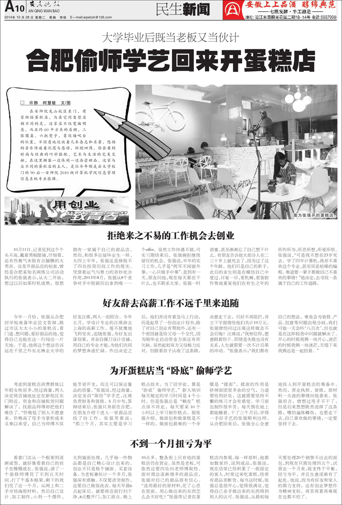编者按:张强是beat3652010级计算机学院信息管理信息系统专业学生。从学校毕业之后,他拒绝了来之不易的工作机会,回到了他所熟悉的龙山校区开起了蛋糕店。10月28日的《安庆晚报》刊登了由beat365学生记者采写的通讯文章,以整版篇幅报道了张强从“偷师学艺”到“扭亏为平”的创业历程。
