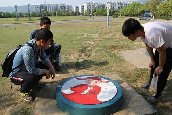忙碌的时光总是过得飞快,到了下午,本次创意井盖画的十二个井盖也已基本完工。经过一天的辛勤创作,书画协会的三十余名同学们在灰白的井盖下塑造了惟妙惟肖的穿着戏服的黄梅戏小人、各式各样的安庆代表性建筑,更有白墙黑瓦的徽派马头墙、安师院地标双龙湖……原本单调乏味的安师院生活区水泥路,被井盖画装点得生动而又活泼。如此风景,自然吸引了路过同学们的频频驻足。“井盖作画,空间有限,创意无限。它利用了有限的资源,创造了无穷的魅力。我要为井盖画点赞!”大二的刘轩颖同学对眼前的这片亮丽的“风光”赞不绝口。而对于忙着拿手机拍照的沈同学来说,这些充满着安庆元素的井盖画有着更加特别的意义:“在这之前,我怎么也想象不到道窨井盖能这么活泼有趣。这些画很有创意的宣传了安庆,井盖画也能为安庆代言。”(学生记者 钱成 秦天宝)