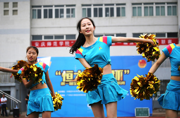 当天,安师院的塑胶运动场上,齐聚16支足球队伍,18支啦啦操团队。鲜红的旗帜在空中飞扬,各队统一的服装,统一的队名口号,还有无数手持手机、单反的现场观众,让比赛现场显得格外热闹。