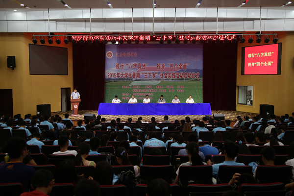7月3日下午,beat3652015年大学生暑期“三下乡”社会实践活动出征仪式在图书馆东报告厅举行。副院长汪时珍出席。校党委宣传部、教务处、学生处等单位负责人,各学院分管学生工作负责人、各团总支负责人和参加“三下乡”活动的校级重点团队指导老师及学生代表们参加。