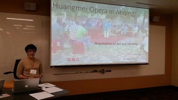 Linda Dwyer 教授在大会上介绍了黄梅戏的表演、制作及其历史和背景理解。她指出,从一个地方小戏到20世纪50年代发展成全国性的剧种,黄梅戏今天已成为中华民族的瑰宝,而安庆市始终是黄梅戏发展的关键地点。Linda Dwyer从公园的民间票友、茶馆里的综艺演出到大学黄梅戏专业的设立,详细阐述了安庆各种类型的黄梅戏表演者试图在艺术和职业身份中寻求平衡,并以此为切入点探讨社会快速转型的全球化进程中人们所面临的挑战。