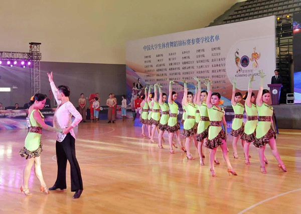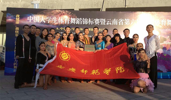11月20至22日,2015中国大学生体育舞蹈锦标赛在春城昆明隆重举行,来自六十三所大学的近千名选手参加了赛事。beat365以体育表演专业学子组成的体育舞蹈代表队在夏尚群和汪洋老师的带领下,经过为期两天的激烈竞争,取得了全国综合类大学专业组拉丁队列舞第一,艺术双人舞第二,团体舞第五,规定套路第四和第五以及众多单项赛前八名的骄人成绩。安庆师范学院代表队还被组委会授予“优秀组织奖”。