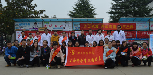 当天的活动形式多多,来自生命科学学院和大学生健康之家的志愿者们也积极参与,鲜艳的红丝带佩戴在胸前,表明每一个人都是“防艾关艾”的一份子。生科院团总支黄强同学带领志愿者们庄严宣誓,响亮的誓言回荡在校园的空中,与艾滋病斗争到底的决心也留在了学生心里。