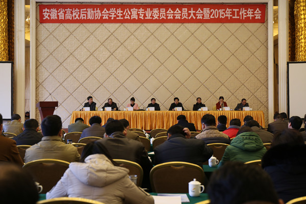 12月30日,由省高校后勤协会学生公寓专业委员会主办、安庆师范学院承办的安徽省高校后勤协会学生公寓专业委员会会员大会暨2015年工作年会在安庆隆重召开,来自全省68所高校和省内外物业公司近200名代表参加了会议。省高校后勤协会秘书长、省教育厅高校后勤管理服务中心主任陈鹏、省高校后勤协会副会长、安庆师范学院副校长刘友忠、蚌埠医学院副校长张武丽、安徽财贸职业学院副院长汪少清、黄山职业技术学院副院长洪岩辉、省教育厅高校后勤管理服务中心副主任高昆等出席会议。