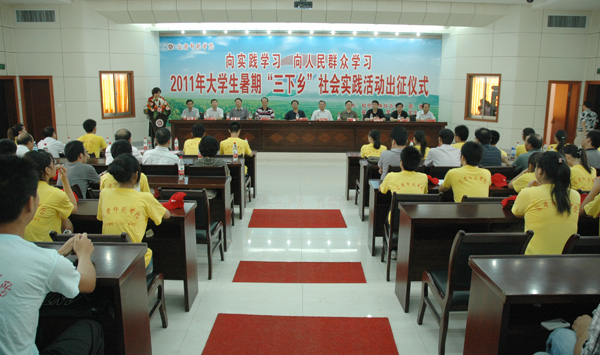 7月7日上午,beat3652011年大学生暑期“三下乡”社会实践出征仪式在龙山校区行政楼一楼会议室隆重举行。校党委书记何小祥,党委副书记、院长朱士群,副院长时新中,党委副书记、纪委书记殷红,党委委员、副院长闵永新、张群、汪时珍,党委委员、党办、院办、外事办主任刘友忠,党委委员、组织部部长陈光明,党委委员、文学院党总支书记、院长方锡球出席仪式,校创先争优办公室、党委宣传部、学生处、团委负责同志,各学院党总支负责人、团总支负责人、学校“三下乡”重点团队以及青年志愿者代表近200百人参加了本次仪式。仪式由校团委副书记刘燕主持。