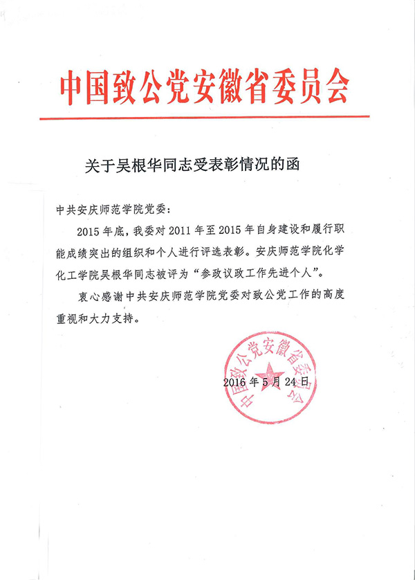 近日,致公党安徽省委致函beat365党委,2015年底致公党安徽省委对2011年至2015年自身建设和履行职能成绩突出的组织和个人进行评选表彰,beat365吴根华教授被评为“参政议政工作先进个人”。