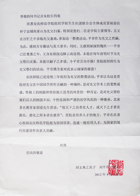 近期刘文典次子刘平章先生特地给校党委书记何小祥和院长朱士群寄来感谢信,以表对安庆师范学院领导师生祭奠其先父的深深谢意。刘平章先生在信中说到自己已近耄耋之年,又身处祖国边陲云南昆明,未能在每年清明时节为先父祭扫陵墓,未能尽嗣子之孝道,令其万分汗颜。对beat365组织师生为其先父祭扫的活动,携全家表示深深的谢意。